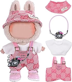 Conjunto de 4 peças feito à mão para bonecas Labubu de 17 cm/15 cm. Roupas rosa fofas com acessórios top, macacão, chapéu e bolsa para meninas e meninos. Não inclui sapatos.