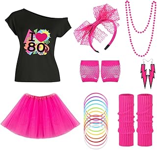 Conjunto de acessórios de fantasia feminina dos anos 80 para o Halloween, inclui camiseta, leggings, saia tutu e polainas para cabeça. Perfeito para festas temáticas e eventos.