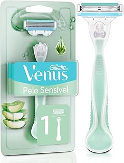 O Gillette Venus Pele Sensível Aparelho de Depilar com Aloe Vera é ideal para peles sensíveis, proporcionando um depilar suave e confortável. Contém Aloe Vera para uma sensação refrescante durante o uso.