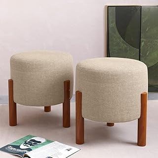 Kit 2 Puff Banquinho Redondo Decorativo Thor em Linho Pés Madeira Maciça Cor Bege