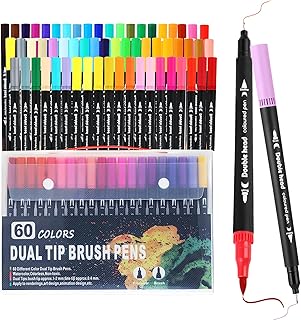 Kit com 60 Canetas Marcadoras de Ponta Dupla, Dupla Ponta (Pincel 1-4mm e Fina 0.4mm), Tinta à Base de Água – Ponta Pincel e Fina para Colorir Adultos, Lettering, Esboços e Ilustração (60)